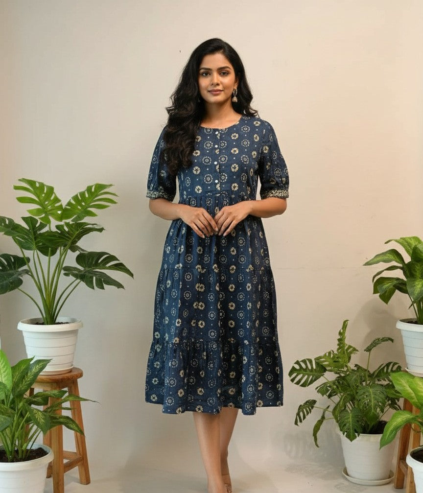 Step out in style with this elegant Indigo Blue Block Print Tiered Midi Dress. Crafted from soft, breathable cotton, this dress features a beautiful all-over traditional motif print in a contrasting light shade. It is designed with a comfortable round neckline, a button placket detail on the bodice, and stylish puffed sleeves with delicate contrasting embroidery/piping at the cuffs. The tiered skirt falls to a flattering midi length, making it a perfect choice for casual outings, brunches, or everyday wear.